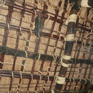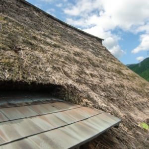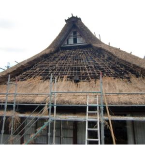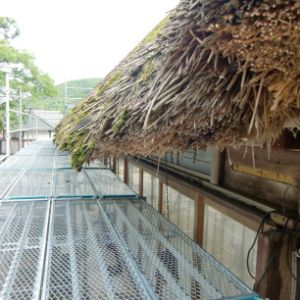 高島市内には職人さんの高齢化により茅葺職人さんがいなくなりました。茅葺き技術の伝承ができなくなりました。2009年に当館は縁あって屋根修復をしてれる職人さんに出会え何とか茅葺き屋根の葺き替えができました。南西、平部分は琵琶湖のいヨシで刺し屋根施工しています。南北、妻側は古い資材を全面撤去して山のススキで葺き替えしています。この面は日本昔話にでてくる屋根の様に少し丸みを持たすように刈り込んでいます。内部ツシ(小屋裏)からは合掌部分が綺麗に残っており小屋組みを身近で見ることができます。職人不足、材料の工面の難しさ、コスト面を考慮すると次回の茅葺きはできないと思っています。地域の伝統的な民家を守っていきたいです。皆様の知恵と御力を御貸しいただけましたら有り難いです。宜しくお願いします。