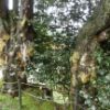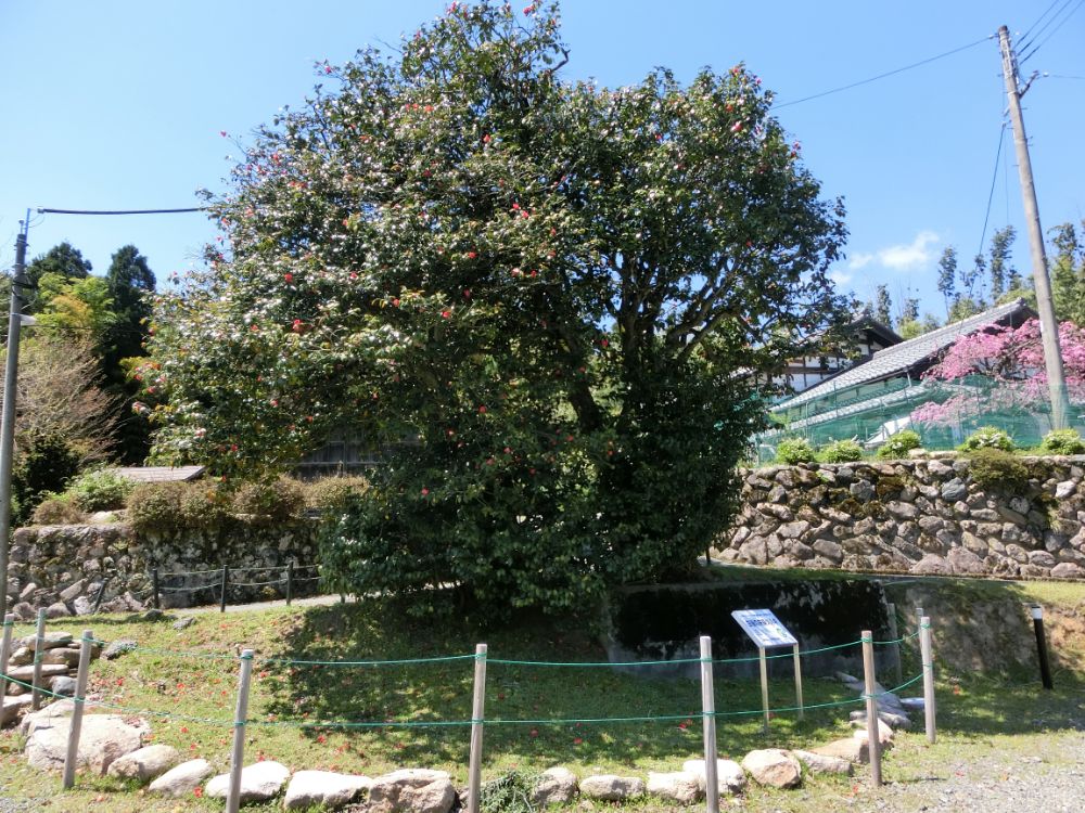 駐車場の際にヤブツバキの大樹が2本寄り添って樹冠を広げて立っています。森鴎外の小説「山椒大遊」にちなんだ言い伝えが残る伝説を秘めた名木です。幹回りが2.6mと1.7mで寄り添う姿に見えることから「白谷の夫婦椿」と呼ばれています。日本でも有数の樹木です。根元からゴツゴツとした瘤状の隆起が盛り上り伸びています。樹木医の先生方からも少し弱ってきているようだと言われていますが4月中旬には大きな花が咲き盛りまだ活きている生命力のある大樹です。この老木をできる限り長く生かしていくために、皆様に知恵と力を頂き御協力宜しくお願いします。